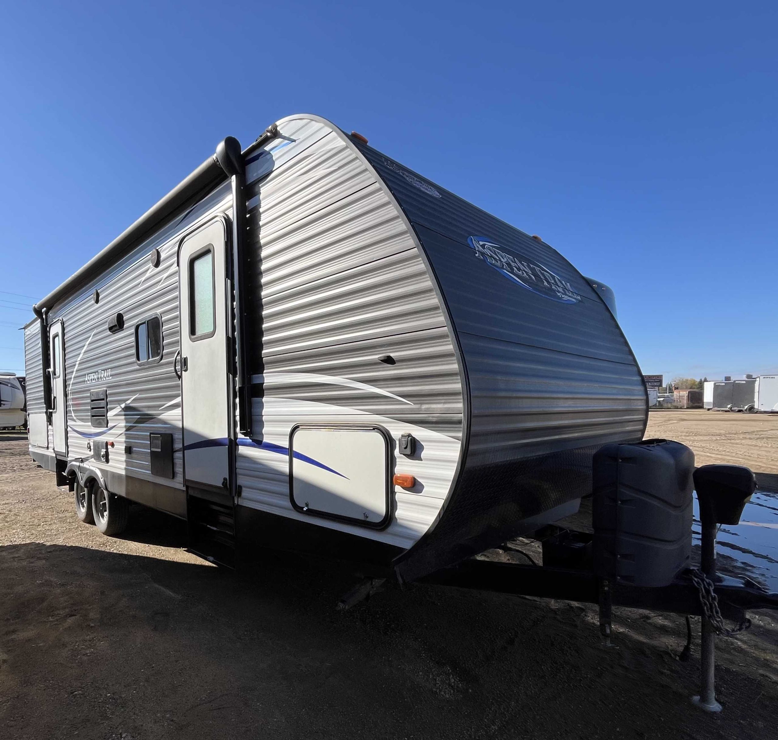 The 2017 Aspen Trail 2790BHS travel trailer has a length of approximately 31′ 11″, weighs about 6,696 lbs dry, and sleeps up to 10 people. Key features include a single slide-out, a front queen bed, double over double rear bunks, a U-shaped dinette, and an optional exterior kitchen. The unit has a 13,500 BTU air conditioner and a 34,000 BTU furnace, with a 52-gallon freshwater tank and 84 gallons of grey water capacity.